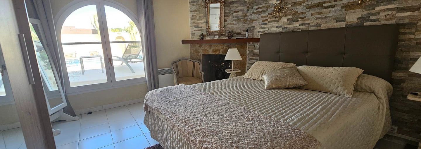 Accès à l'ensemble des espaces extérieurs, jardin paysagé, piscine, cuisine d'été, salons, terrasses, terrain de pétanque, trampoline.